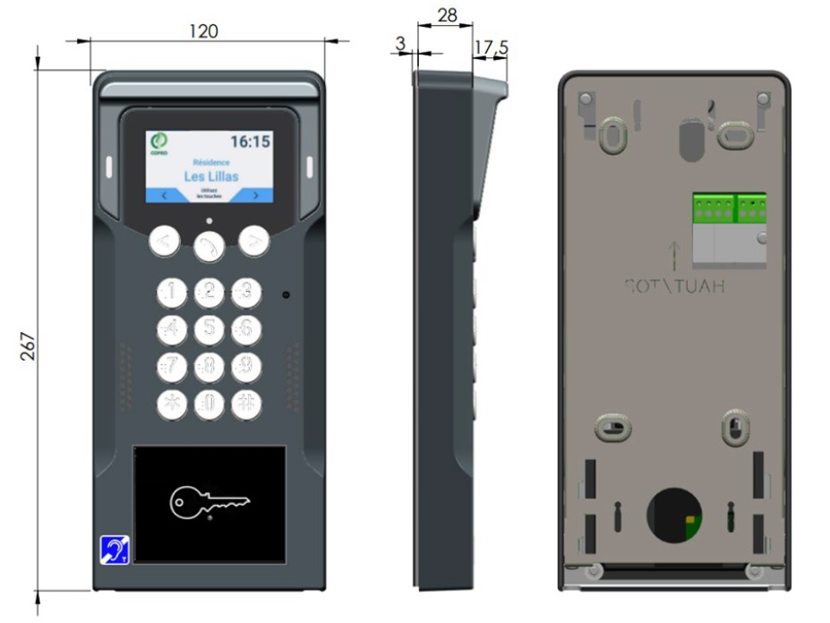 • 1 Only-One opbouw video-intercom met kleuren LCD-scherm en scrollpaneel voor de namen, met gecodeerd toetsenbord met 12 verlichte toetsen en handsfree proximitylezer. Afwerking Zamak