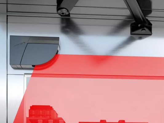 Rechtse BEA LZR-FLATSCAN SW laser scanner sensor voor het beveiligen van geautomatiseerde draaideuren.