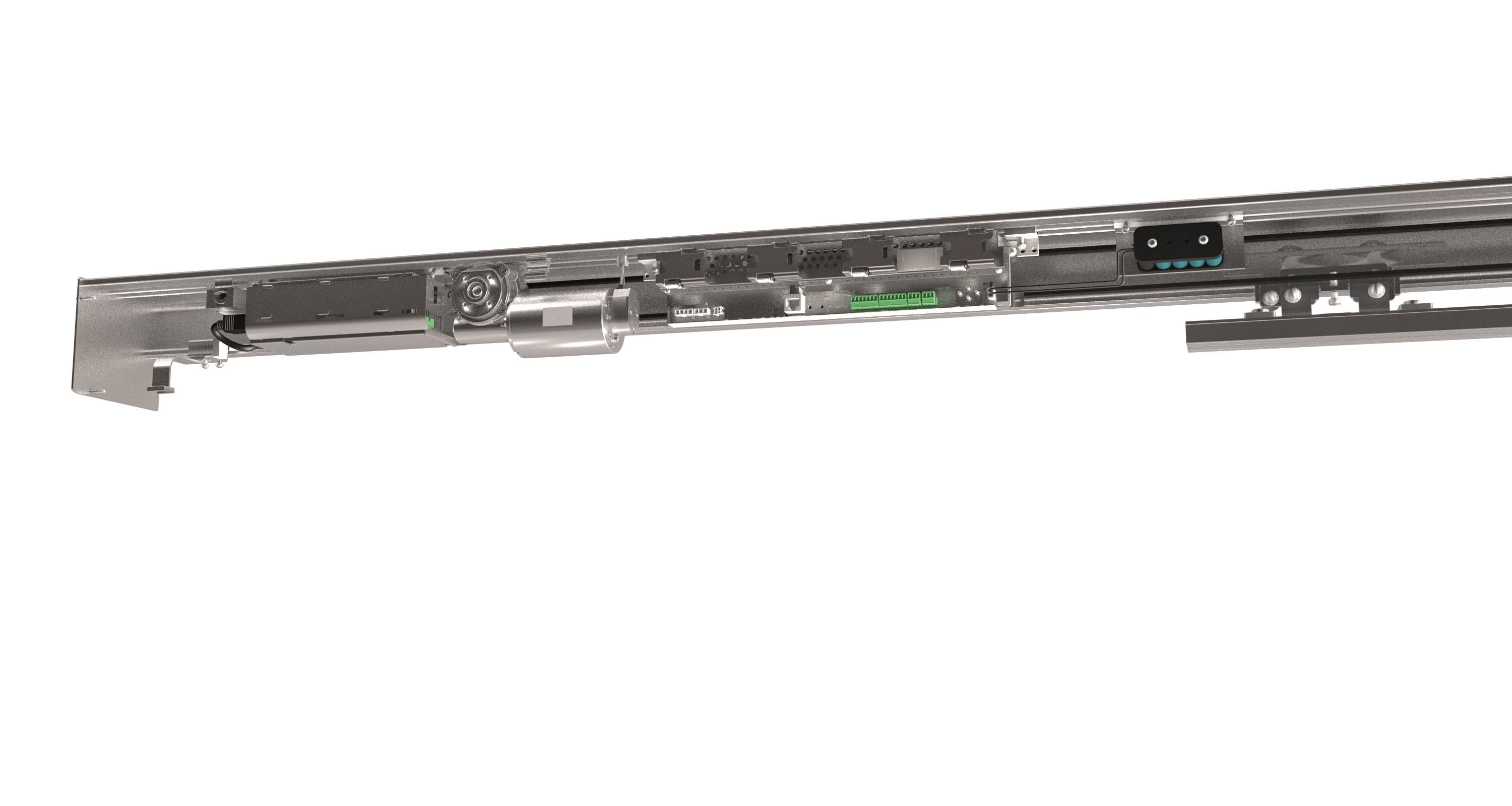 Opérateur de porte coulissante sur mesure et assemblé pour une porte coulissante à 1 vantail. Longueur d'entraînement LT = 3600mm / Passage libre PL = 1715mm
