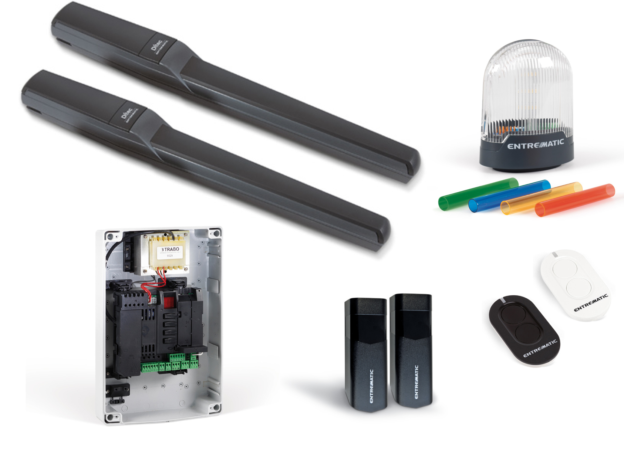 Inhoud: 2 aandrijvingen PWR35H + 1 besturingskast LCU40H met ingebouwde radio-ontvanger + 1 set LIN2 fotocellen + 2 2-kanaals afstandsbedieningen met rolling code+ Lamp FL24 met antenne en 5 m coaxkabel